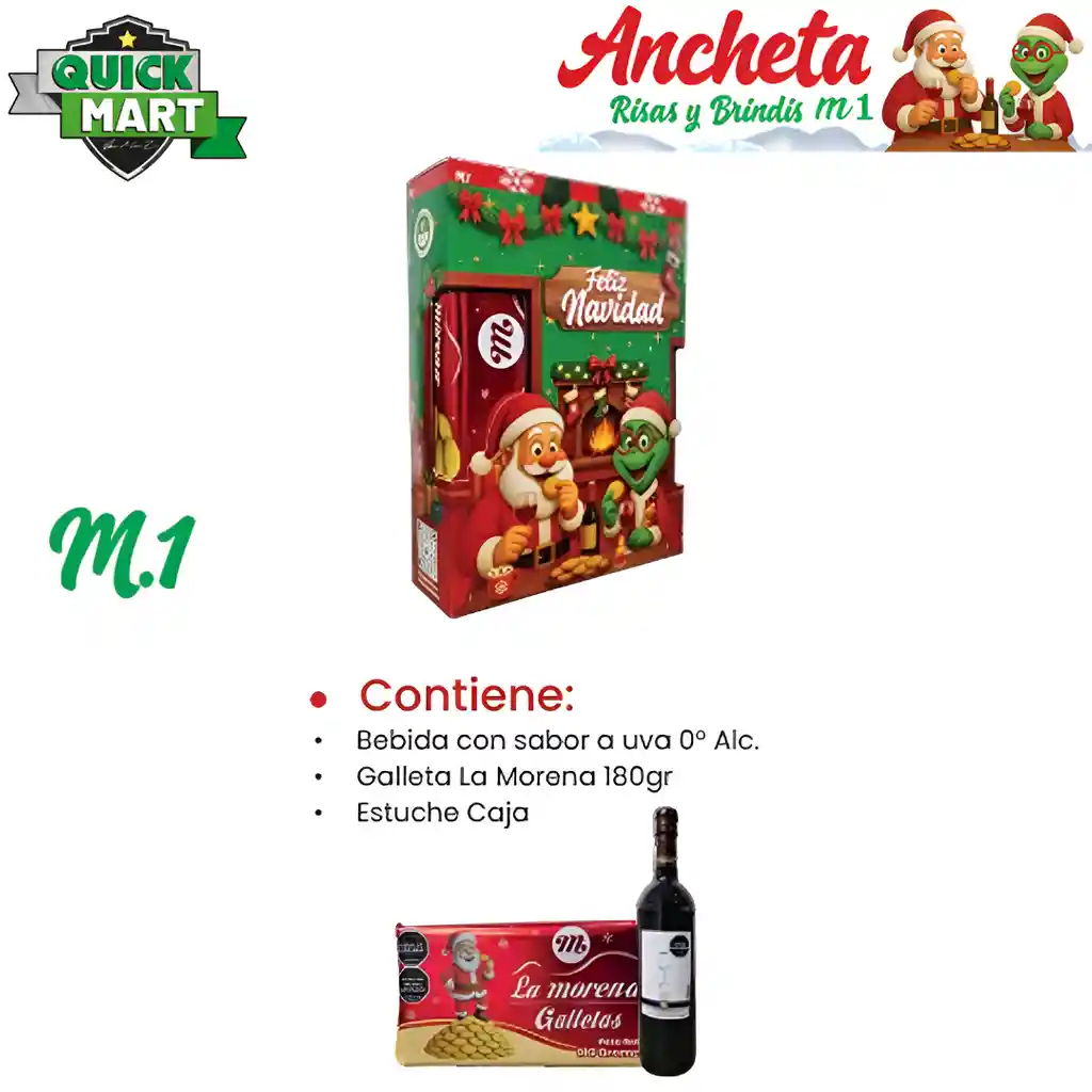 Celebre la temporada navideña con la Ancheta Navideña Matrimonio M.1, un práctico y simbólico detalle presentado en una caja de regalo. Esta ancheta contiene una selección básica pensada para brindar en pareja durante las fiestas, incluyendo una bebida con sabor a uva sin alcohol para un brindis inclusivo y galletas La Morena para acompañar el momento. Ideal como detalle simbólico para regalar a parejas, para celebrar en familia con personas que no consumen alcohol, o como un pequeño obsequio navideño que transmite buenos deseos. Su presentación en caja la hace perfecta para entregar como regalo en eventos de diciembre, reuniendo en un solo estuche un gesto dulce para compartir. Contiene: Bebida con sabor a uva 0° alcohol Galleta La Morena 180 g Estuche en caja de regalo ______________________________________________________ ________ Somos QUICK MART Comercializadora y Distribuidora de productos Nacionales e Importados, calidad garantizada 100% original. Dentro de nuestro portafolio de productos podrás encontrar licores (debidamente estampillados), alimentos, dulces, productos de aseo y mucho más de acuerdo a tu necesidad. Estamos ubicados en la ciudad de Bogotá, por medio de MERCADO ENVÍOS hacemos despachos a nivel nacional, si compras antes de la 14pm por MERCADO FLEX entregamos el mismo día (aplica solo para Bogotá), en horario extendido hasta las 10 p.m. Invitamos a nuestros clientes a visitar nuestra tienda virtual en MercadoShop con las mismas garantías de Mercado Libre, allí podrás conocer todo nuestro catálogo y encontrar promociones que solo aplican en nuestra tienda virtual. Las imágenes utilizadas son de referencia y por lo tanto la presentación del producto puede variar en el momento del despacho, el producto es el mismo ya el empaque depende de cada proveedor. ______________________________________________________________