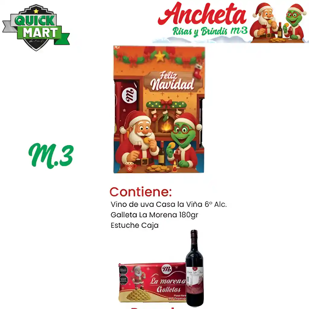 Celebre la temporada navideña con la Ancheta Navideña Matrimonio M.3, un práctico y simbólico detalle presentado en una caja de regalo. Esta ancheta contiene una selección básica pensada para brindar en pareja durante las fiestas, incluyendo un vino de uva Casa de la Viña (6° alcohol) para un brindis especial y galletas La Morena para acompañar el momento. Ideal como detalle simbólico para regalar a parejas, para celebrar en familia con un toque festivo, o como un pequeño obsequio navideño que transmite buenos deseos. Su presentación en caja la hace perfecta para entregar como regalo en eventos de diciembre, reuniendo en un solo estuche un gesto dulce para compartir. Contiene: Vino de uva Casa de la Viña 6° alcohol Galleta La Morena 180 g Estuche en caja de regalo ______________________________________________________ ________ Somos QUICK MART Comercializadora y Distribuidora de productos Nacionales e Importados, calidad garantizada 100% original. Dentro de nuestro portafolio de productos podrás encontrar licores (debidamente estampillados), alimentos, dulces, productos de aseo y mucho más de acuerdo a tu necesidad. Estamos ubicados en la ciudad de Bogotá, por medio de MERCADO ENVÍOS hacemos despachos a nivel nacional, si compras antes de la 14pm por MERCADO FLEX entregamos el mismo día (aplica solo para Bogotá), en horario extendido hasta las 10 p.m. Invitamos a nuestros clientes a visitar nuestra tienda virtual en MercadoShop con las mismas garantías de Mercado Libre, allí podrás conocer todo nuestro catálogo y encontrar promociones que solo aplican en nuestra tienda virtual. Las imágenes utilizadas son de referencia y por lo tanto la presentación del producto puede variar en el momento del despacho, el producto es el mismo ya el empaque depende de cada proveedor. El exceso de alcohol es perjudicial para la salud. Prohíbase el expendio de bebidas embriagantes a menores de edad. ______________________________________________________________