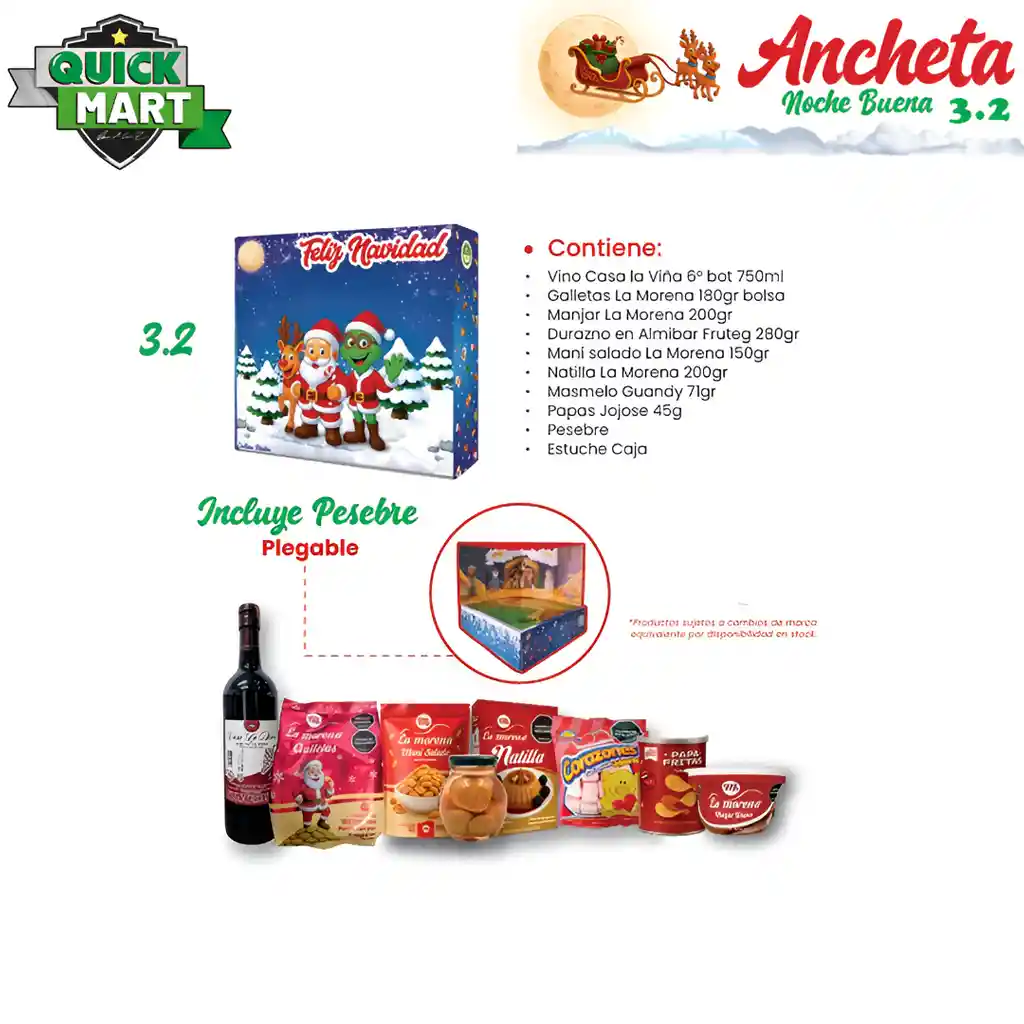 Celebre la temporada navideña con la Ancheta Navideña Noche Buena 3.2, un cuidadoso ensamble de productos típicos colombianos presentados en una elegante caja de regalo. Esta ancheta contiene una selección pensada para compartir en familia durante las fiestas de fin de año, incluyendo un vino Casa la Viña para los brindis, galletas y manjar La Morena para acompañar las reuniones, duraznos en almíbar Fruteg como postre, maní salado para el picoteo, natilla tradicional, masmelos Guandy, papas Jojose como snack, y un decorativo pesebre para ambientar su hogar. Ideal como regalo empresarial, para obsequiar a seres queridos o para disfrutar en casa durante las celebraciones de diciembre, reuniendo en un solo estuche los sabores y la esencia de una Navidad colombiana. Contiene: Vino Casa la Viña 6° botella 750 ml Galletas La Morena 180 g bolsa Manjar La Morena 200 g Durazno en Almíbar Fruteg 280 g Maní salado La Morena 150 g Natilla La Morena 200 g Masmelo Guandy 71 g Papas Jojose 45 g Pesebre decorativo Estuche en caja de regalo ______________________________________________________ ________ Somos QUICK MART Comercializadora y Distribuidora de productos Nacionales e Importados, calidad garantizada 100% original. Dentro de nuestro portafolio de productos podrás encontrar licores (debidamente estampillados), alimentos, dulces, productos de aseo y mucho más de acuerdo a tu necesidad. Estamos ubicados en la ciudad de Bogotá, por medio de MERCADO ENVÍOS hacemos despachos a nivel nacional, si compras antes de la 14pm por MERCADO FLEX entregamos el mismo día (aplica solo para Bogotá), en horario extendido hasta las 10 p.m. Invitamos a nuestros clientes a visitar nuestra tienda virtual en MercadoShop con las mismas garantías de Mercado Libre, allí podrás conocer todo nuestro catálogo y encontrar promociones que solo aplican en nuestra tienda virtual. Las imágenes utilizadas son de referencia y por lo tanto la presentación del producto puede variar en el momento del despacho, el producto es el mismo ya el empaque depende de cada proveedor. El exceso de alcohol es perjudicial para la salud. Prohíbase el expendio de bebidas embriagantes a menores de edad. ______________________________________________________________