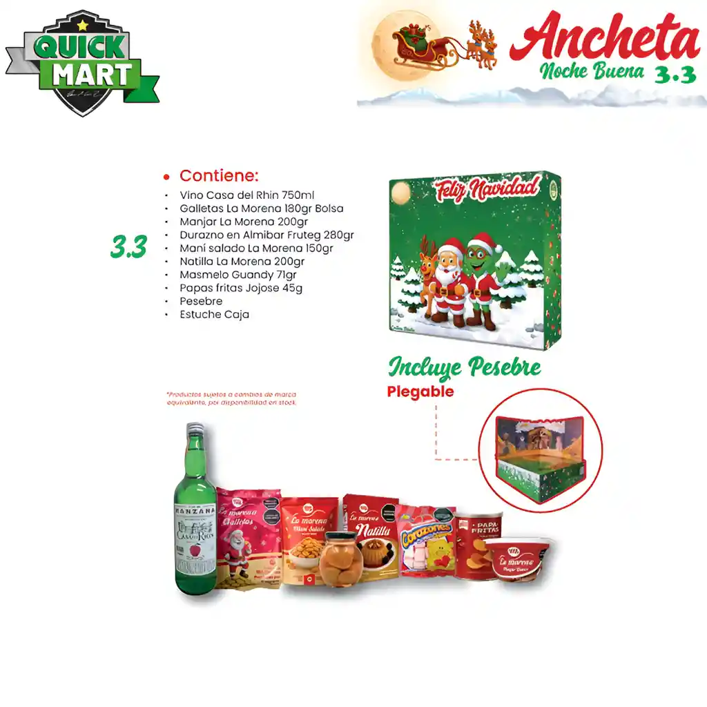 Celebre la temporada navideña con la Ancheta Navideña Noche Buena 3.3, un cuidadoso ensamble de productos típicos colombianos presentados en una elegante caja de regalo. Esta ancheta contiene una selección pensada para compartir en familia durante las fiestas de fin de año, incluyendo un vino Casa del Rhin para los brindis, galletas y manjar La Morena para acompañar las reuniones, duraznos en almíbar Fruteg como postre, maní salado para el picoteo, natilla tradicional, masmelos Guandy, papas fritas Jojose como snack, y un decorativo pesebre para ambientar su hogar. Ideal como regalo empresarial, para obsequiar a seres queridos o para disfrutar en casa durante las celebraciones de diciembre, reuniendo en un solo estuche los sabores y la esencia de una Navidad colombiana. Contiene: Vino Casa del Rhin botella 750 ml Galletas La Morena 180 g bolsa Manjar La Morena 200 g Durazno en Almíbar Fruteg 280 g Maní salado La Morena 150 g Natilla La Morena 200 g Masmelo Guandy 71 g Papas fritas Jojose 45 g Pesebre decorativo Estuche en caja de regalo ______________________________________________________ ________ Somos QUICK MART Comercializadora y Distribuidora de productos Nacionales e Importados, calidad garantizada 100% original. Dentro de nuestro portafolio de productos podrás encontrar licores (debidamente estampillados), alimentos, dulces, productos de aseo y mucho más de acuerdo a tu necesidad. Estamos ubicados en la ciudad de Bogotá, por medio de MERCADO ENVÍOS hacemos despachos a nivel nacional, si compras antes de la 14pm por MERCADO FLEX entregamos el mismo día (aplica solo para Bogotá), en horario extendido hasta las 10 p.m. Invitamos a nuestros clientes a visitar nuestra tienda virtual en MercadoShop con las mismas garantías de Mercado Libre, allí podrás conocer todo nuestro catálogo y encontrar promociones que solo aplican en nuestra tienda virtual. Las imágenes utilizadas son de referencia y por lo tanto la presentación del producto puede variar en el momento del despacho, el producto es el mismo ya el empaque depende de cada proveedor. El exceso de alcohol es perjudicial para la salud. Prohíbase el expendio de bebidas embriagantes a menores de edad. ______________________________________________________________
