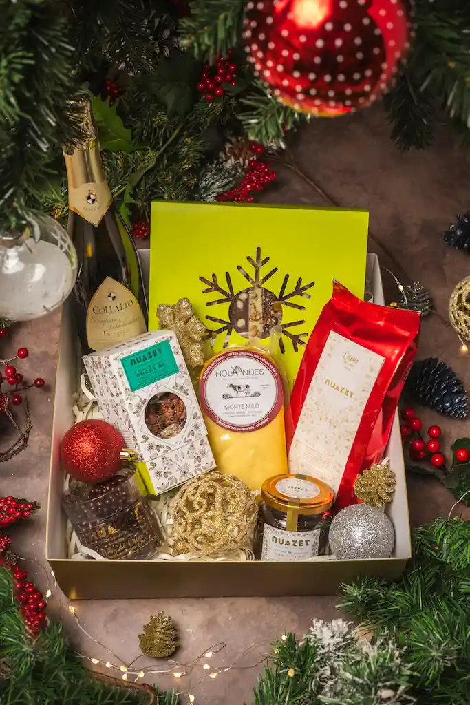 Disfruta de una noche buena diferente y sobretodo: Muy divertida Incluye: Barritas, nibs de cacao cubiertos con chocolate 200 gr, queso holandes 250 gr, Confitura, Cacao en polvo 350 gr y Rocas