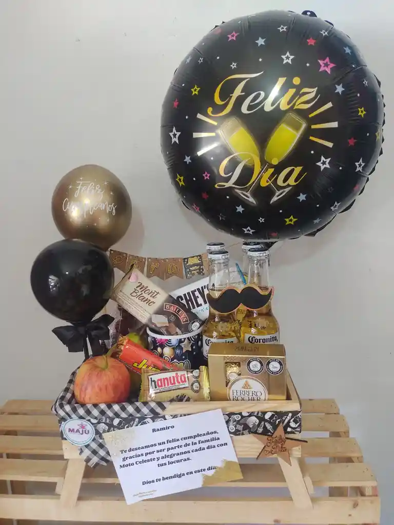 ancheta con 4 cervezas corona ,mug con mensaje,chocolate baileys,chocolatina americana ,chocolatina jumbo,frutas manzana y pera fresas en contenedor chocolate hanuta relleno de nutela ,caja chocolate ferrerobase en madera con globo metalizado