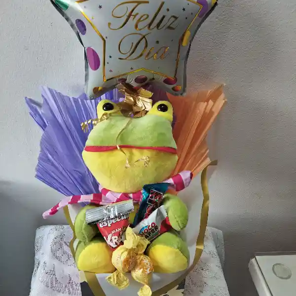 Caja decorada con globo, peluche, Mani crack, galleta, 3 chocolates, empaque celofán para la entrega y decoración .