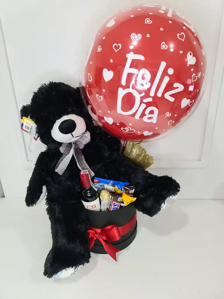 ANCHETA EN CAJA CIRCULAR DE LUJO, CON CHOCOLATES Y VINO MINI: INCLUYE GLOBO, PELUCHE, CHOCOLATES.
