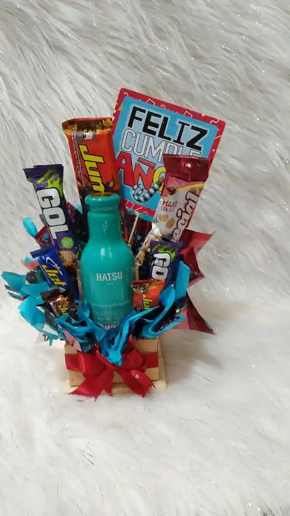 Ancheta pequeña con productos según foto de referencia y pin decorativo