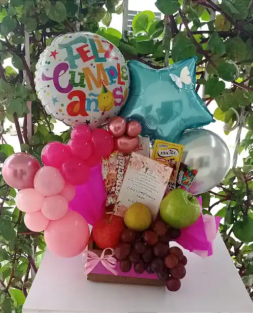 Base madera decorada con lazo, 2 globos metalizados pequeños Decoración con orgánico pequeño: 1 maní, 1 nucita, 1 chocolate, 1 manzana verde, 1 manzana roja , Media lb de uva , 1 durazno y Tarjeta.