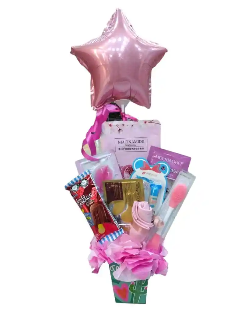 Contiene: Mascarrilla Velo de Niacinamide Macarrilla Peel Off Exfoliante Manual Paleta Hidrogel Contorno de ojo Hidrogel Labios Chocomelos Plaleta 19gr Medias Tobilleras Rosadas Labial Hidratante Farres Caja y Decoracion Globo mediano metalizado