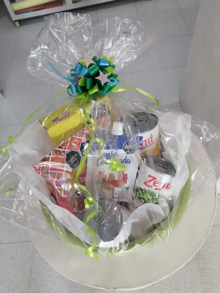 buñuelos, galletas, arveja lata, maiz dulce lata, salchicha viena, lechera, recipiente ´plastico, empaque y moño y globo