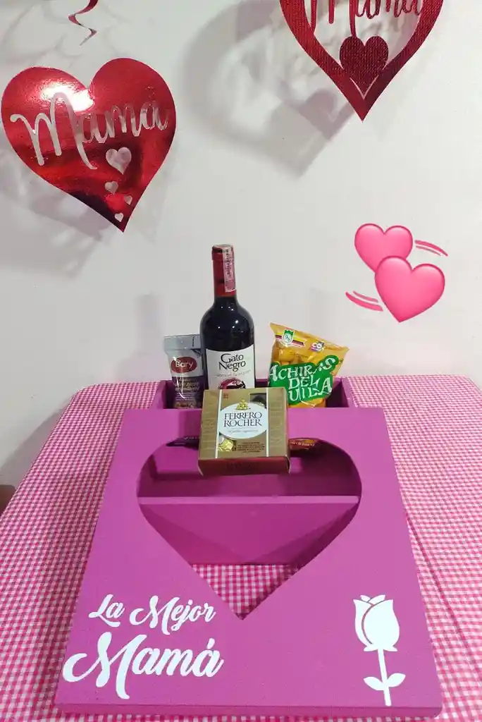 ANCHETA REGALO CAJA MADERA PARA MAMÁ GATO NEGRO, CAJA MADERA ROSADA, VINO GATO NEGRO GRANDE, ACHIRAS, FRUTOS SECOS, FERRERO