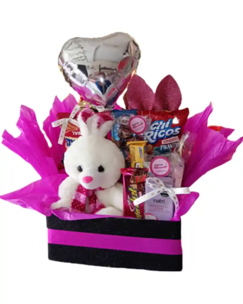 Ancheta linda con peluche de coneja, comestibles deliciosos y una hermosa presentacion , ideal para celebrar una ocasaion especial o para convertir un dia en uno inolvidable, incluye tu mensaje personal