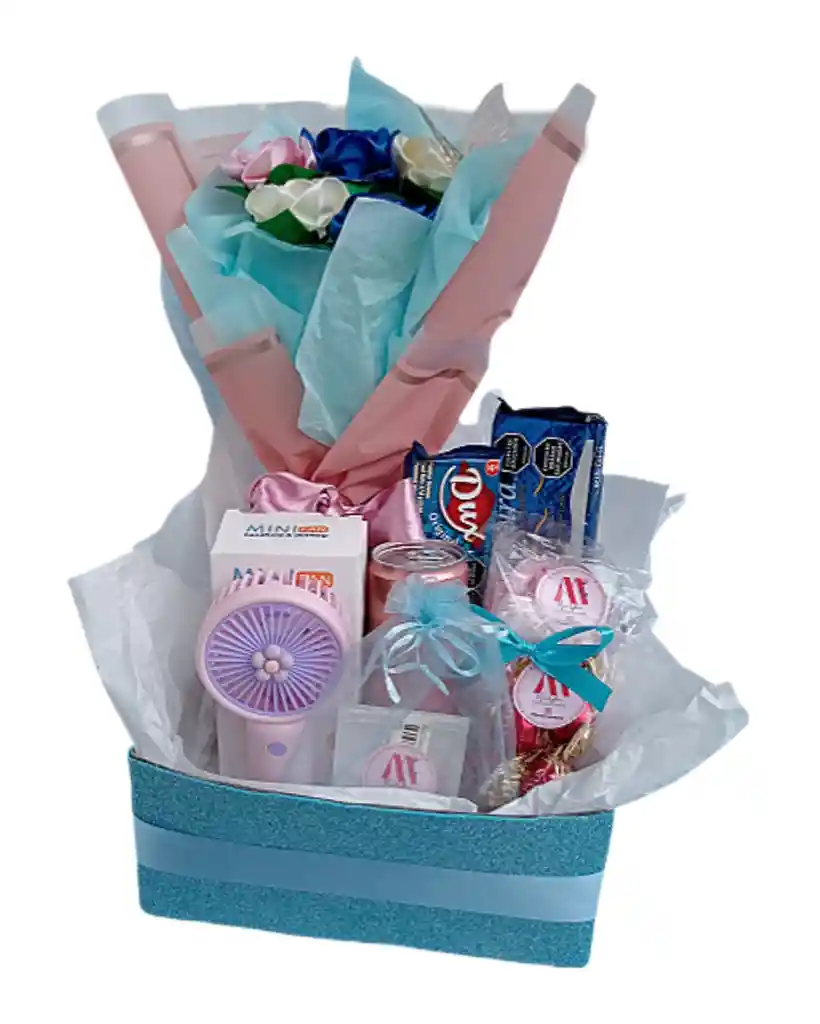 ¡Celebra con alegría y sorpresa! 🎉 La Ancheta Celebración Divertida es el detalle perfecto para esa persona super especial en su día. Incluye un hermoso ramo de rosas, un encantador fan mini y una selección de comestibles deliciosos que incluyen irresistibles chocolates. Este regalo no solo transmite cariño, sino que también garantiza una sonrisa radiante. 🥳✨ ¡Haz que su día sea inolvidable con esta hermosa y práctica ancheta!