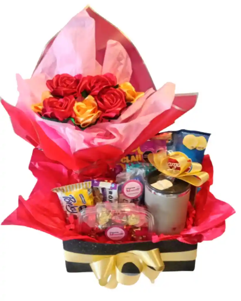 Celebra momentos únicos con nuestro Arreglo de regalo con flores, un vaso térmico para bebidas calientes o frías y snacks, el detalle perfecto para sorprender en cumpleaños, aniversarios o cualquier ocasión especial. Este elegante arreglo combina la espontaneidad y belleza de flores eternas con una deliciosa variedad de snacks incluyendo chocolates rellenos , creando un regalo que cautiva todos los sentidos. Haz tu pedido producto listo y regala sonrisas hoy mismo.
