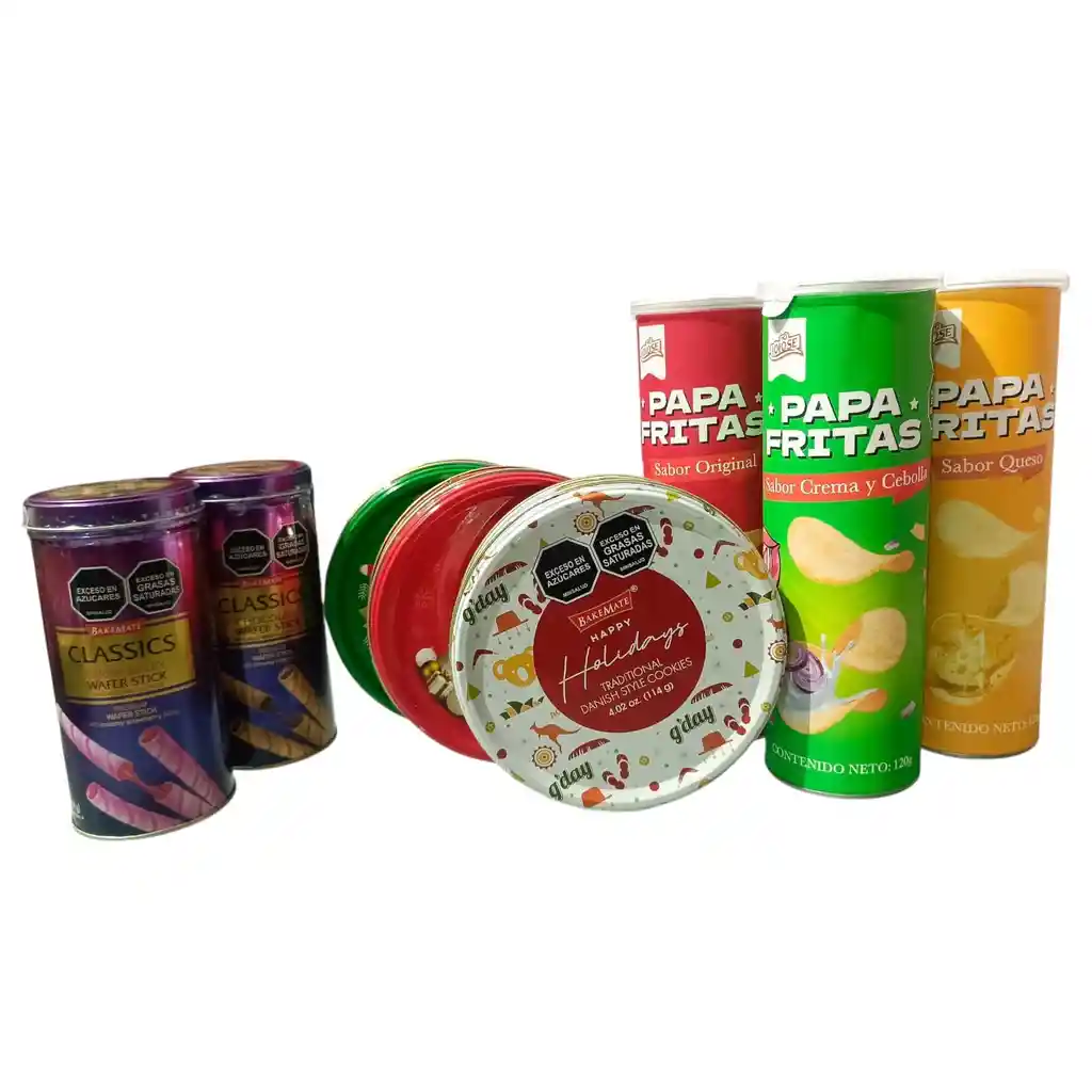 Incluye: 3 tarros galletas mantequilla 1114gr c/u 3 papas grandes 120gr c/u 2 tarros barquillos 114 gr c/u