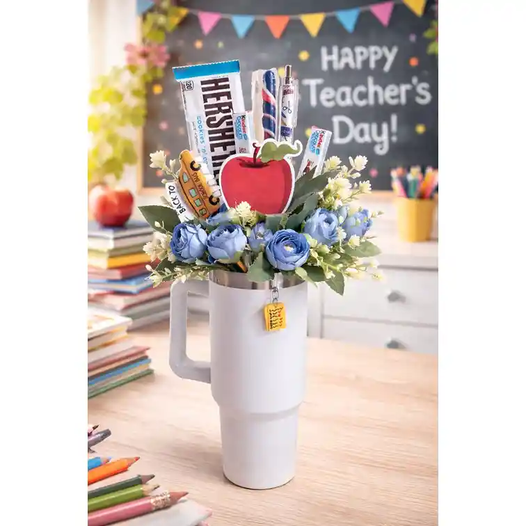 Ancheta regalo para el día del Maestro - Teachers Day - Profesor contenido: 1 vaso termico 1 agenda de post 1 boligrafo 1 llavero 1 Clip para Pelo 1 hersheys grande 1 Kinder 1 caramero espiral 1 tarjeta para la maestra se envia color a Disponiblidad