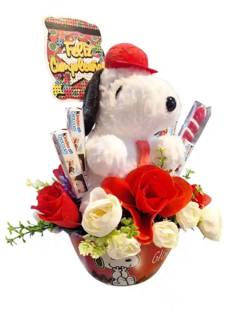 Ancheta Regalo Snoopy Sorpresa Cumpleaños 1 Vaso para cereal Snoopy 1 peluche Snoopy 4 barras de chocolate Kinder 1 caramelo