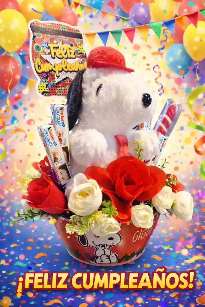 Ancheta Regalo Snoopy Sorpresa Cumpleaños 1 Vaso para cereal Snoopy 1 peluche Snoopy 4 barras de chocolate Kinder 1 caramelo