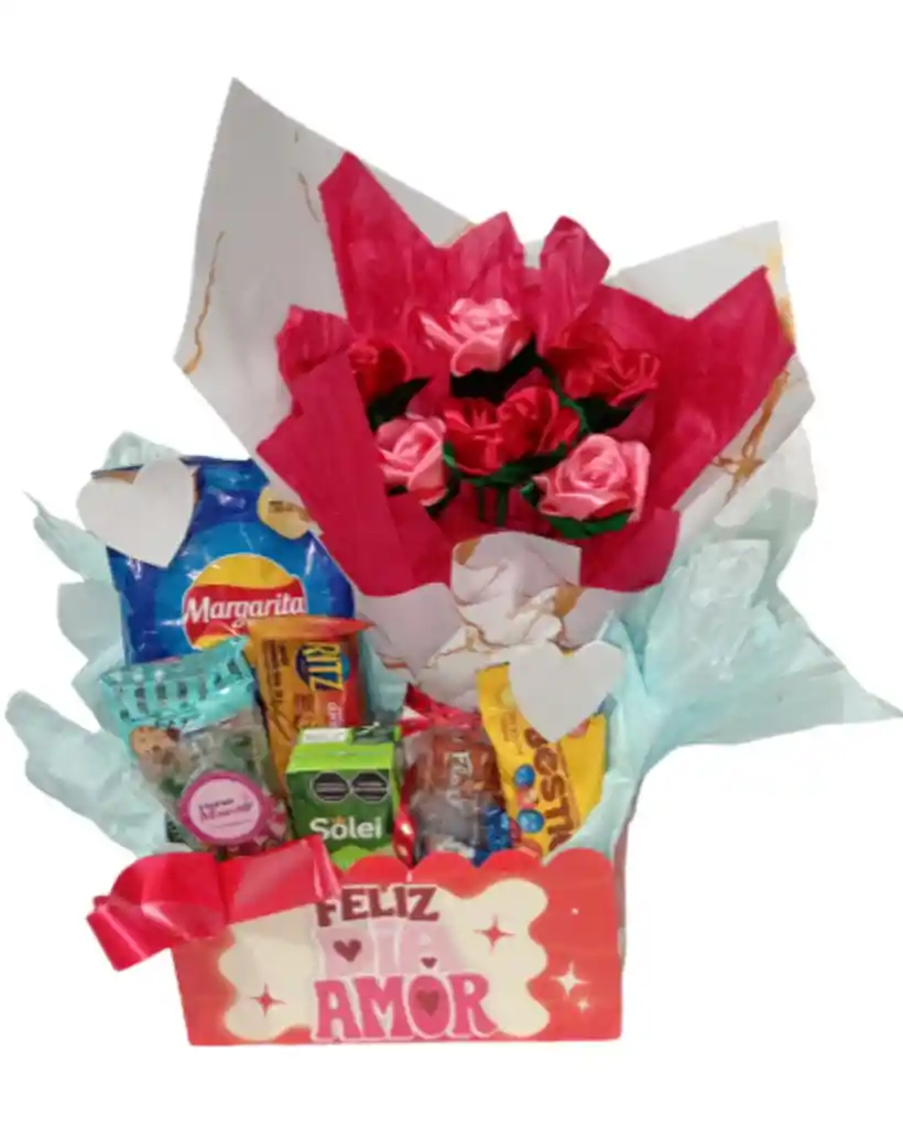Sorprende a tus seres queridos con nuestra Canasta regalo con flores y snacks, una combinación perfecta de belleza y sabor. Este detalle incluye flores eternas seleccionadas cuidadosamente junto a una variedad deliciosa de snacks para disfrutar en cualquier momento. Ideal para cumpleaños, aniversarios o para expresar cariño de forma especial. Haz que cada regalo sea memorable con un toque de belleza , eternidad y alegria