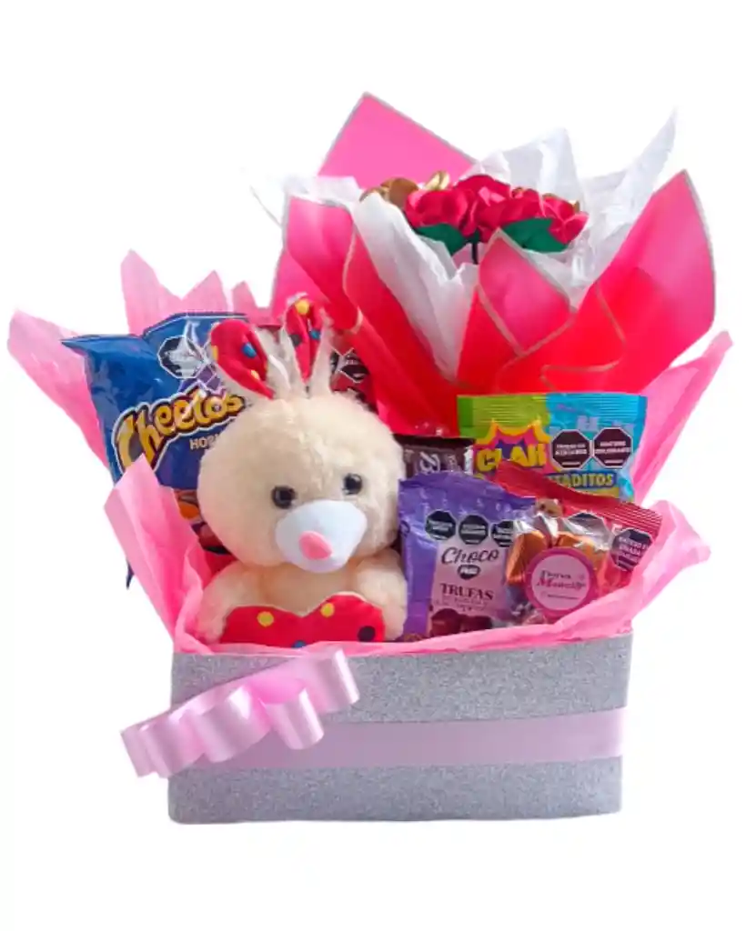 hermosa ancheta con peluche de conejo, ramo de rosas eternas y comestibles deliciosos