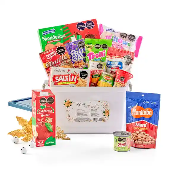 Contiene 14 Unidades. Arequipe Alquerida Tradicional Vaso 150 g + Colosal Bebida Achocolatada 200 g + Cuisine & Co Durazno Mitade Almibar 1 Und + Cuisine & Co Galleta Saltin Salada 175 g + Navideña Modelo (24Pl/1/200 g) + Trolli Anayconda 39 g x12 Mani Japonés 150 g + Millows Surtidos 75 g (20Bs/1/75 g) + Natilla Kassel Arequipe 300 g x 20 + California Nectar Manzana Tb 900 mL + Zenu Salchicha Viena Sabor Limón 150 g + Maiz Tierno 248 g + Mora Mermelada 200 g + Caja Tayrona Nº 3 Alta 11 L - Renos y Trineos 2025.