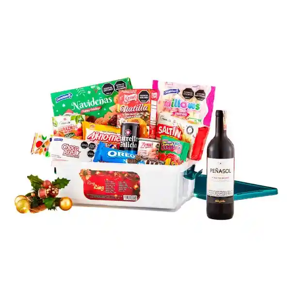 Contiene 13 Unidades. La Ancheta Especial ha Sido Cuidadosamente Seleccionada Para Ofrecer Una Variedad de Productos Deliciosos y de Alta Calidad Ideales Para Compartir en Cualquier Ocasión Especial. Caja Tayrona no. 4 Baja 10 L - Ring Ring 2024 + Vino Tinto Penasol Botella Selección 750 mL + Chocobreak Mono Surtido + Duraznos Cuisine & Co Mitades Almíbar 410 g + Natilla Kassel Arequipe 300 g + Salchicha Viena Limón Zenu Edición Especial 150 g + Sopa Instantánea Fideo Ajinomen Pollo 80 g + Galleta Oreo Original 135 g + Galletas Navideñas Surtidas 200 g + Galletas Cuisine & Co Saltin Salada 175 g + Cerveza Estrella Galicia 0.0% Lata 330 mL + Masmelos Millows 75 g + Gelatina Frutino Fresa 14 g.