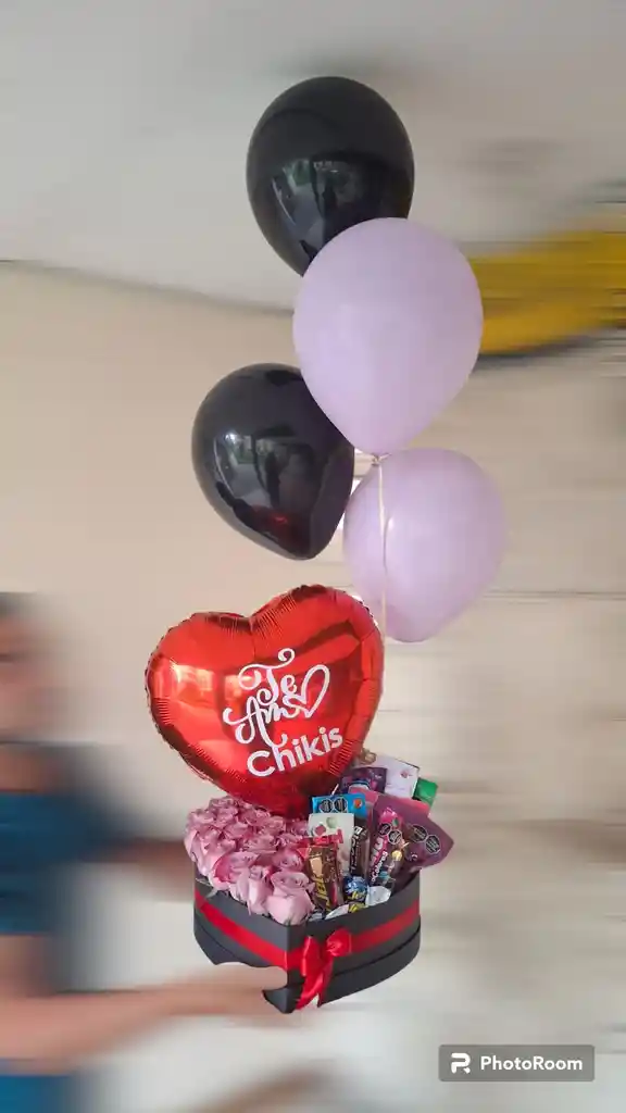Caja de cartón rígido (forma y color según disponibilidad) con 22 rosas (color según disponibilidad), dulces variados, globo corazón metalizado y ramillete de globos en helio.