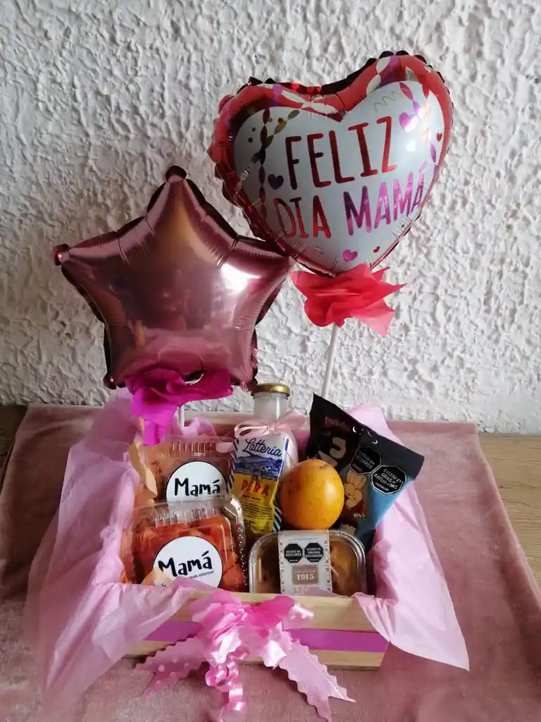 Ancheta saludable incluye: caja en madera, 2 globos, papaya, cereal, yogur natural, granadilla, leche asada,queso, masmelos trululu, se entrega decorado con moño y tarjeta.
