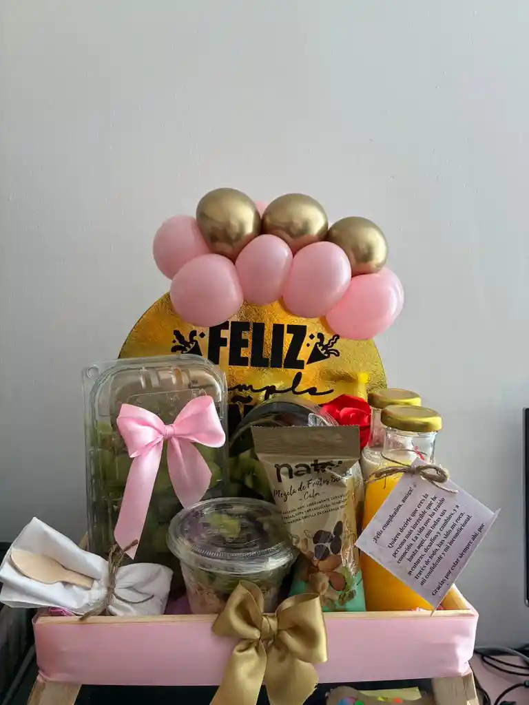 Bandeja decorada para la ocasión que elijas. Incluye: *Fruta picada *Batido de avena, banano y leche descremada *Jugo de naranja *Parfait *frutos secos TARJETA PERSONALIZADA GRATIS