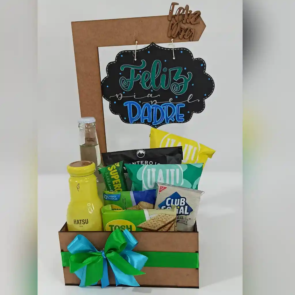 Huacal de madera con pizarra personalizada y lazo, 1 té hatsu, 1 soda hatsu, 1 rosquitas, 1 crispetas, 1 paitas monyerojo, 2 galletas Tosh surtidas, 1 galleta club social integral, 1 barra de granola