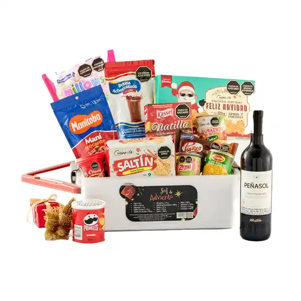 Contiene 14 Unidades. Penasol Vino Tinto Seleccion Botella 750 mL + Millows Surtidos 75 g (20Bs/1/75 g) + Cuisine & Co Galleta Saltin Salada 175 g + Cuisine & Co Galleta Navidad Surtidas 220 g + Piazza Chocolate (36Bj/1/44 g) + Pringles Papa Original 37 g + Mani Japonés 150 g + Natilla Kassel Arequipe x 300 g x 20 + Maiz Tierno 248 g + Zenu Salchicha Viena Sabor Limón 150 g + Cuisine & CoDurazno Mitades Almibar 1 Und + Alquerida Arequipe Tradicional Vaso 150 g + Colosal Bebida Achocolatada 200 g + Caja Tayrona Nº 4 Baja 10 L - Sol de Adviento 2025.