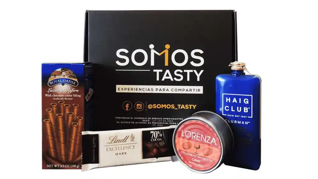 El Kit De Regalo Somos Fuertes Incluye: Whiskey Haig Clubman 200 mL + Chocolate Lindt Excellence 70% Cocoa 40 g (Suiza) + Torta De Amaretto (Colombia) + Barquillos De Chocolate Royal Dansk 100 g (Dinamarca).
