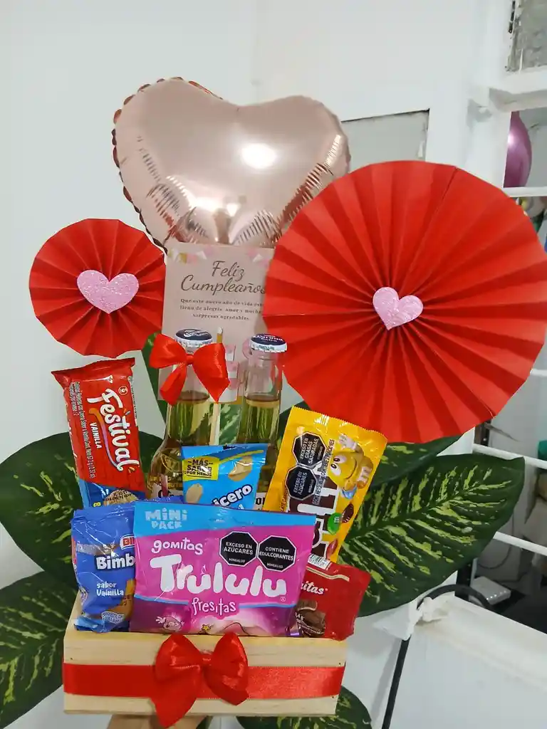 Ancheta con 2 coronitas, galletas festival x 8, maní, choco disk, gomas, Bimbolete, galletas morenitas, caja decorada con globo corazón con vinilo, tarjeta personalizada, rosetones y moños.