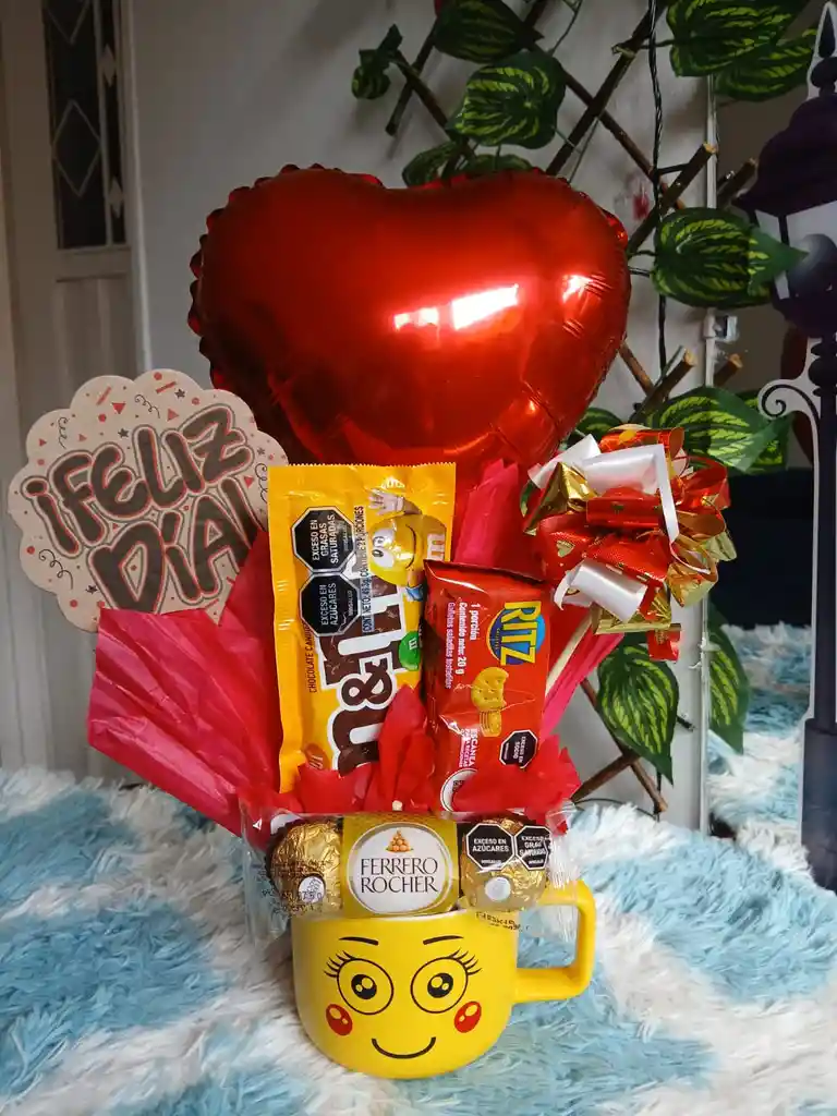 Mug emoji, chocolates Ferrero Rocher x3, MYM, galletas ritz, decorado con globo de corazón, tarjeta y moño.