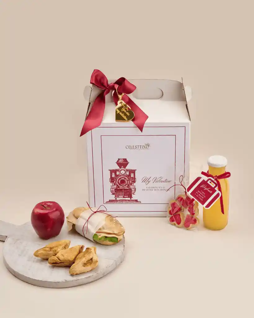 Un desayuno pensado para sorprender desde el primer momento, en nuestra coleccion de San Valentin el Tren del Amor. con sabores clásicos y detalles que enamoran. Una selección deliciosa que acompaña el inicio del recorrido: -Jugo de naranja natural -tres pastelitos de pollo recién horneados, -Un sandwich gourmet con queso mozarella, jamón, cogollo fresco y nuestra salsa de la casa -Una manzana -Galleticas en forma de corazón que endulzan el trayecto. -Como recuerdo del viaje, un llavero acrílico dorado con la leyenda “You are my valentine”, un detalle que queda para siempre. Todo llega presentado en nuestra hermosa caja maletín, con estampado exclusivo del Tren del Amor, diseñada para hacer de esta primera parada un momento inolvidable.