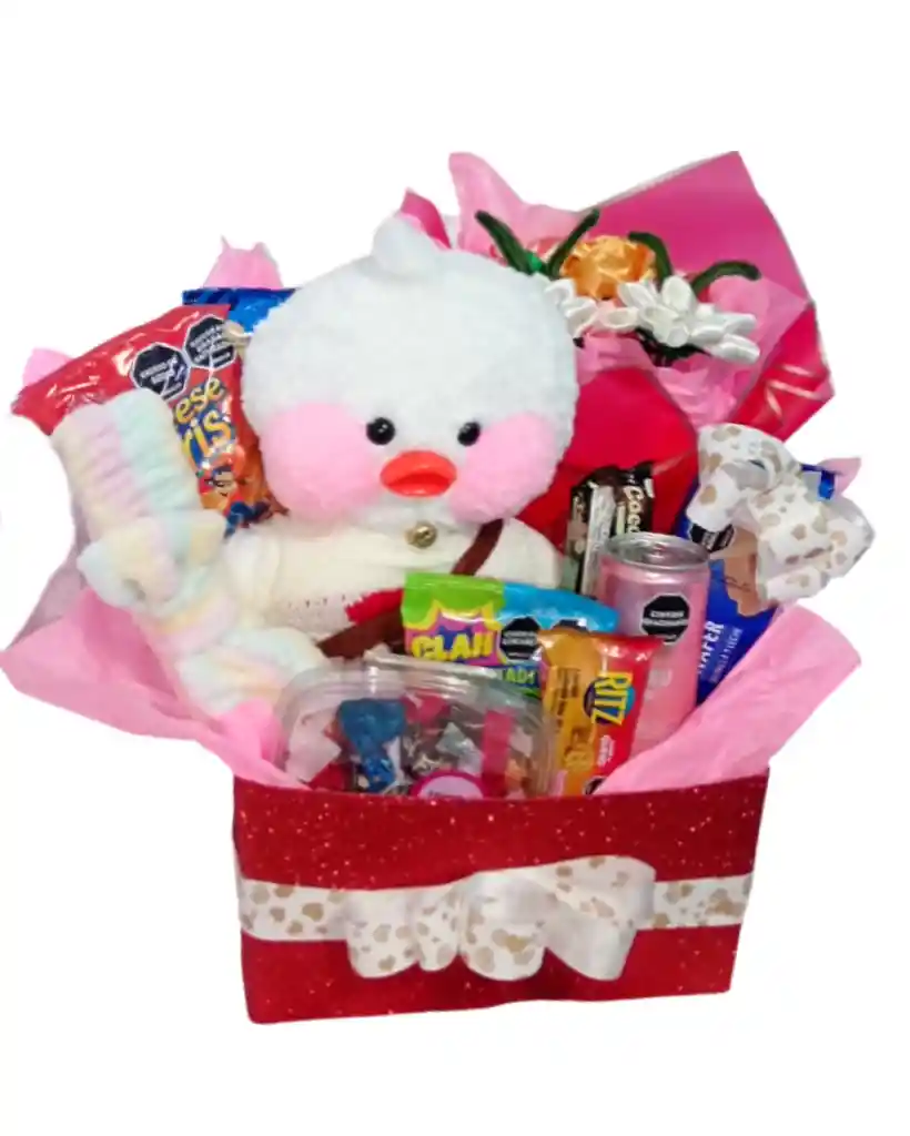 Celebra momentos únicos con nuestra Caja regalo con peluche y snacks, el detalle perfecto para sorprender a esa persona especial. Esta caja incluye un adorable peluche suave y una selección de snacks deliciosos que alegrarán su día especial para aniversarios, cumpleaños.