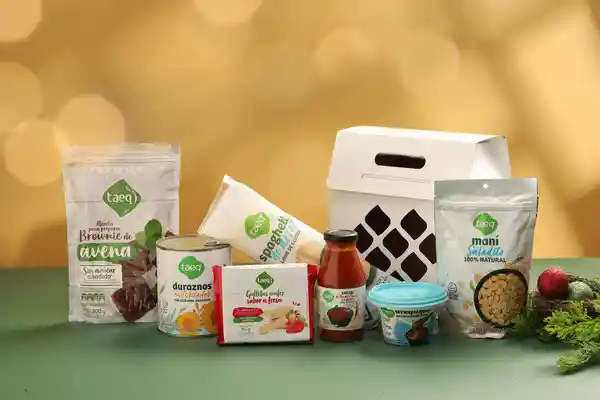 Contiene 8 Unidades. Mezcla Brownie Avena 300 g + Wafer Taco Fresa Sin Azúcar 1 Und + Salsa de Tomate y Albahaca 260 g + Arequipe Sin Azúcar 250 g + Duraznos en Mitades 810 g + Maní Saladito 200 g + Caja Ancheta Taeq 1 Und + Spaghetti Arroz 250 g.