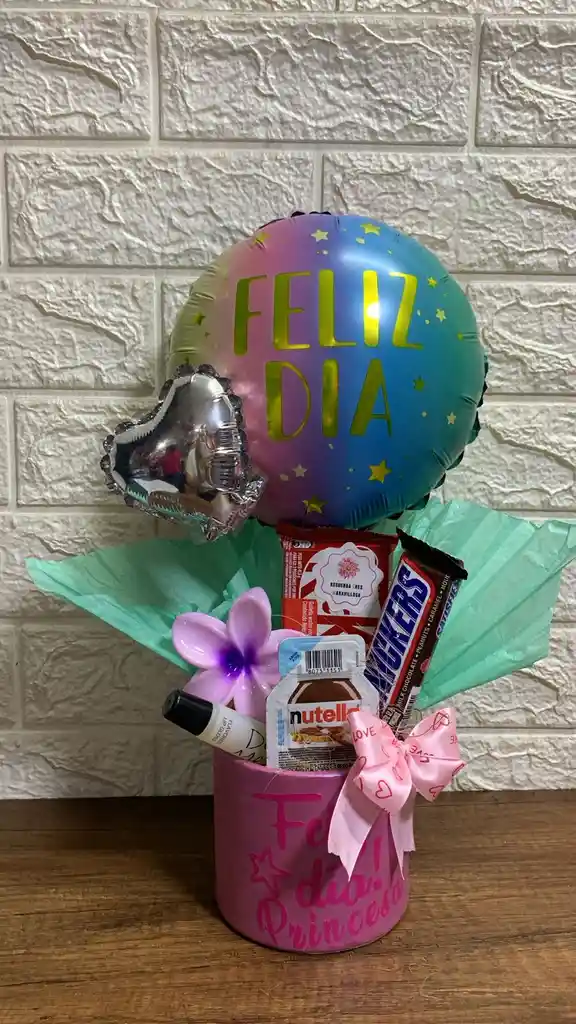 leccione una configuración para mostrar el precio Encantador regalo con chocolates variados, mini Nutella, brillo labial, kit kat, chocolate americano, pinza para el cabello en forma de flor y globos de "Feliz Día", ideal para sorprender a una princesa en cualquier ocasión especial.