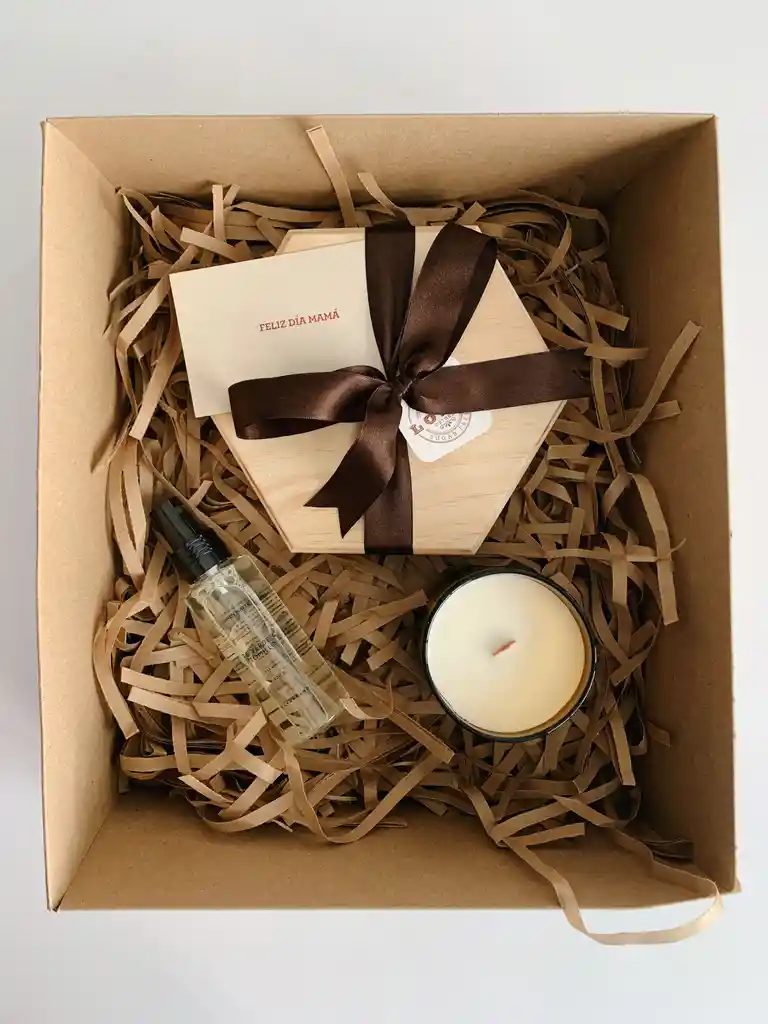 Caja de pino con 20 trufas. vela de LA VERANERA. agua de linos OLFABRAND