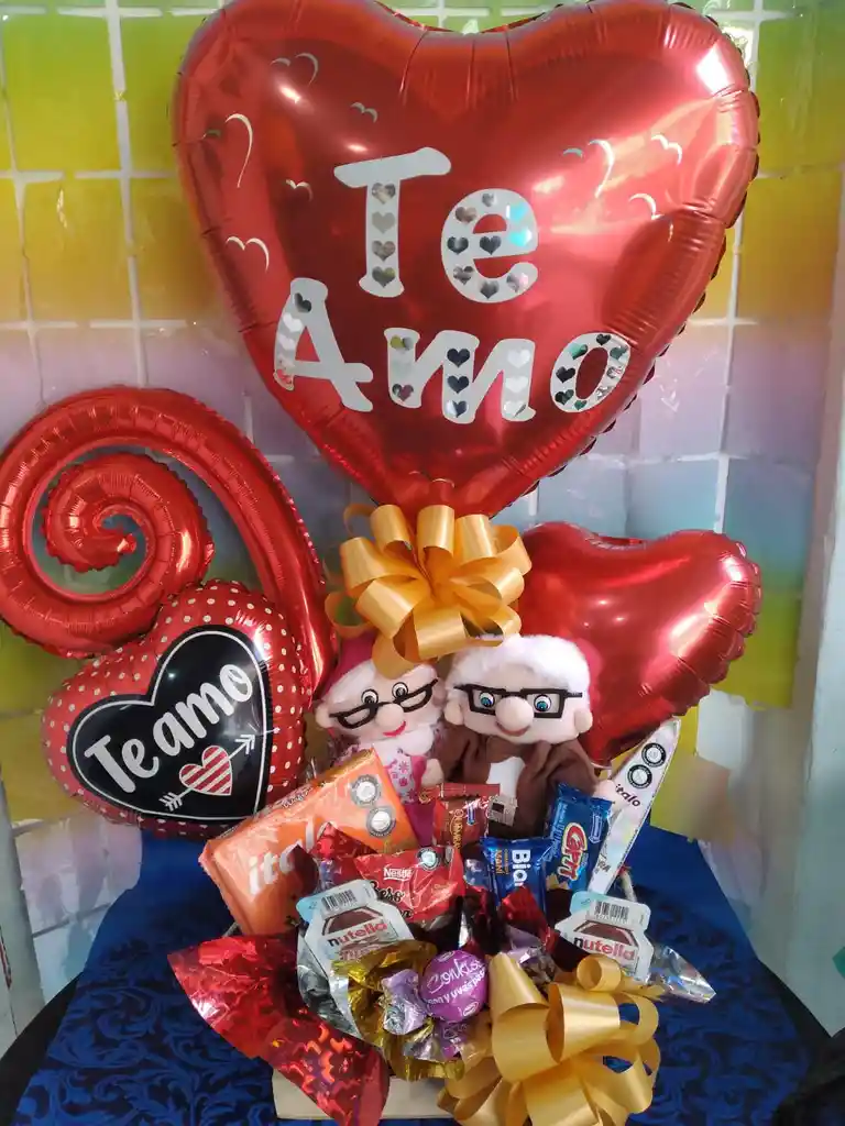 hermosa ancheta para enamorar, con globos de diferentes tamaños de te amo, dulces variados, pareja pequeña de abuelitos, y base de madera