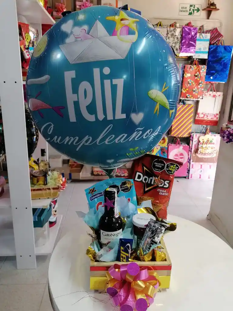 caja madera ., dulces, vino pequeño gato negro , globo-