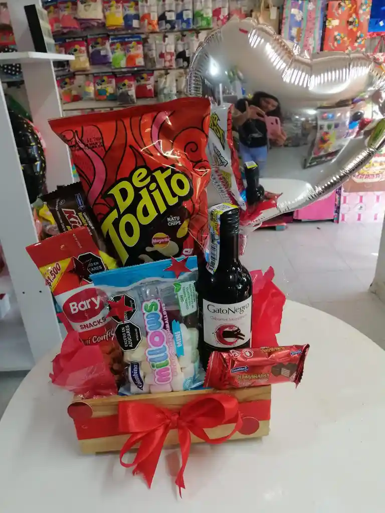Contiene: 1 vino mini gato negro, dulces, caja madera pino decorada. Y globo.