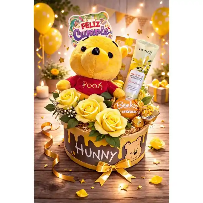 Ancheta Winnie Pooh - Regalo cumpleaños - amor - Dia especial - sopresa 1 Peluche 1 plato para cereal 1 mascarilla facial 1 crema de manos 1 chocolate