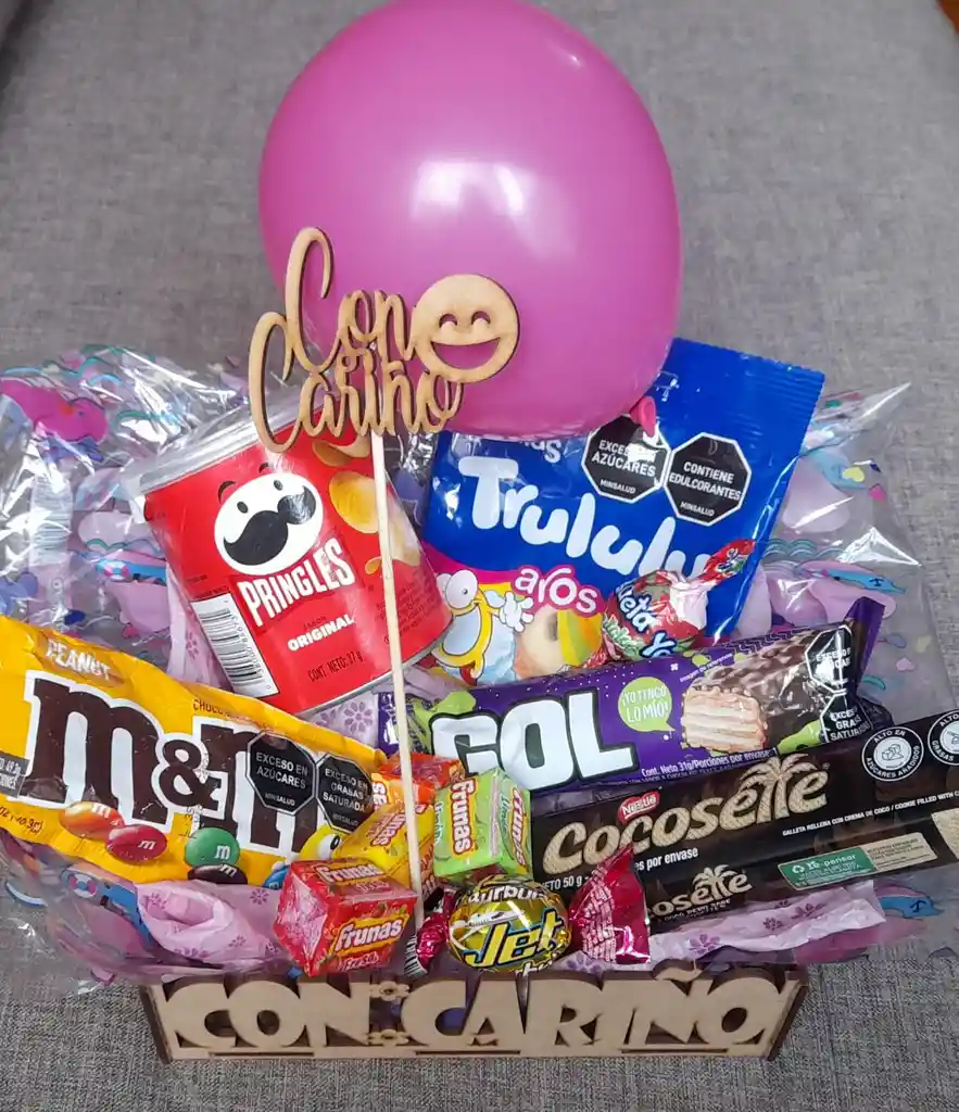 Hermosa ancheta regalo con diversos dulces segun foto. Contiene: 1 tarro pequeño de papas pringles 1 mm 1 gomitas trululu 1 cocosette 1 galleta gol 4 frutas 1 yogetta 1 burbuja jet 1 bomba 1 aplicación con mensaje