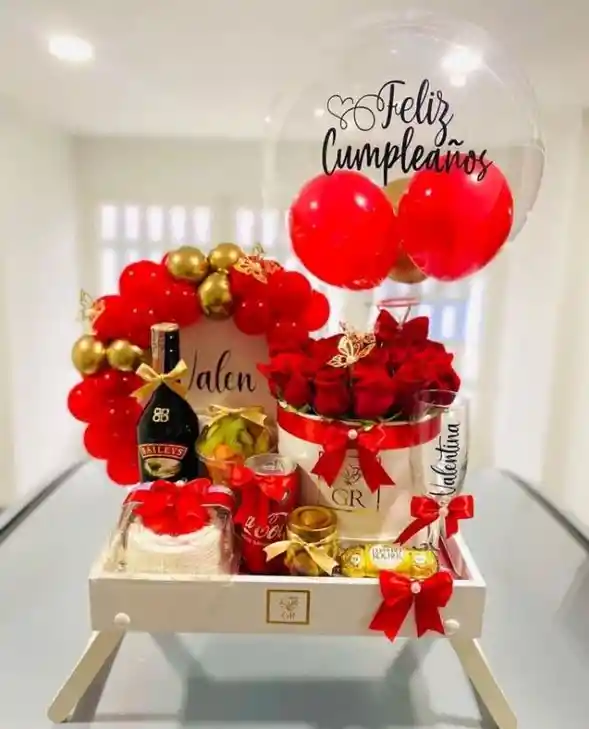 Contenido: -Flores -Botella de baileys -Lata de cocacola o otra bebida de preferencia - Copa personalizada -Porcion de torta pequeña - Frutas -Chocolates - Globos - Caja de madera -Tarjeta personalizada Adiciones: - Globo burbuja marcado 15,000 - Arreglo floral 50.000 - Peluches desde 20.000