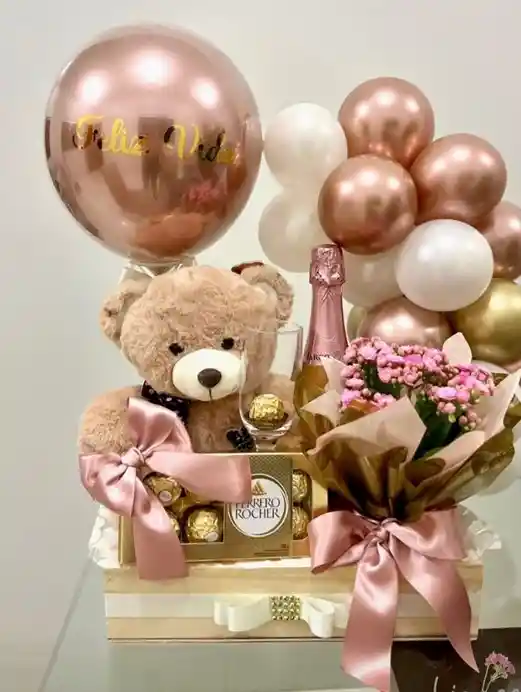 Contenido - Peluche - Chocolates - Copa -Champañee -Arreglo floral -Globos satinados -Tarjeta personalizda -Caja de madera Adiciones: - Globo burbuja marcado 15,000 - Arreglo floral 50.000 - Peluches desde 20.000