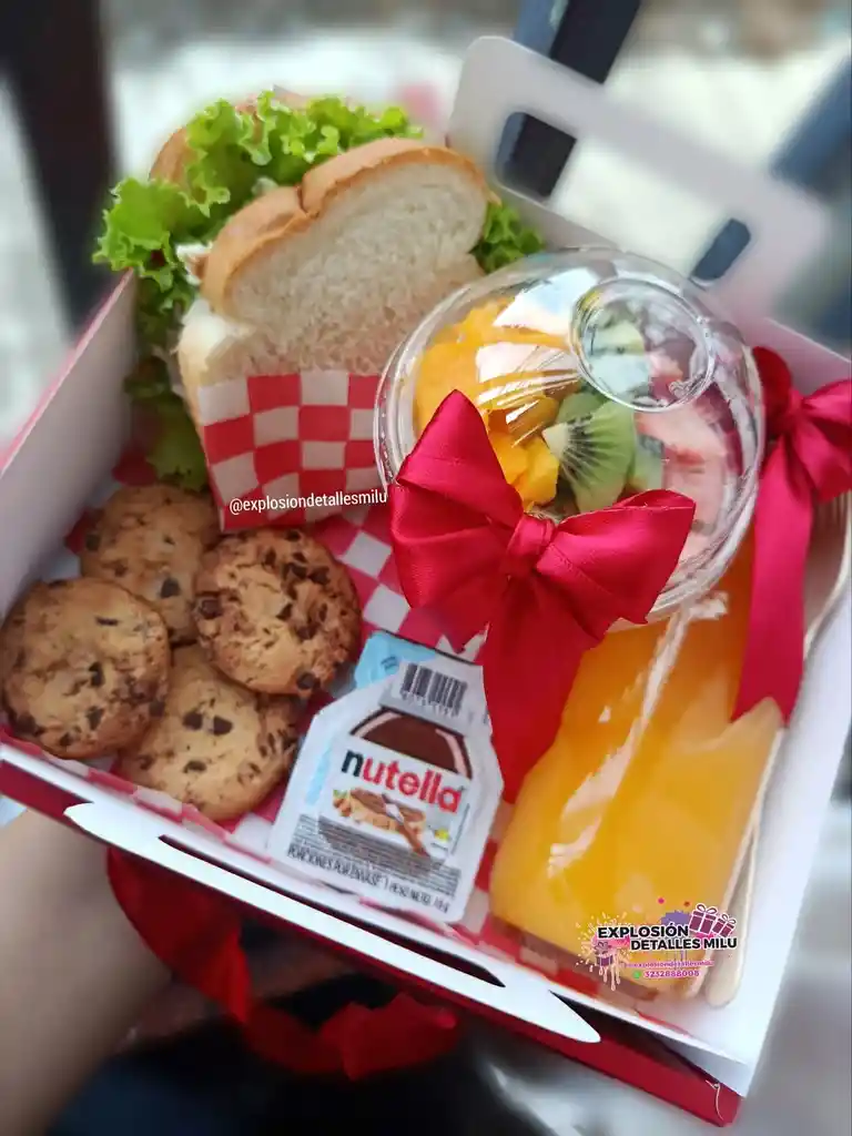 Caja de cartón con:Fruta picada, sanduche, bebida, galletas, chocolate. Incluye tarjeta personalizada. Imagen de referencia, presentación sujeta a disponibilidad