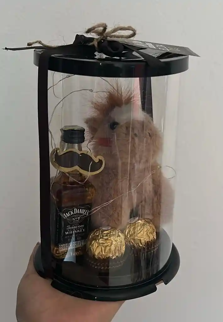 ANCHETAS DETALLES O REGALOS PARA HOMBRE CILINDRO CABALLO + JACK DANIELS MINI + CHOCOLATES FERRERO COD.1040-1 (( INCLUYE LLAVERO CABALLO, JACK DANIELS MINI, CHOCOLATES FERRERO, LUCES, DECORACION ))