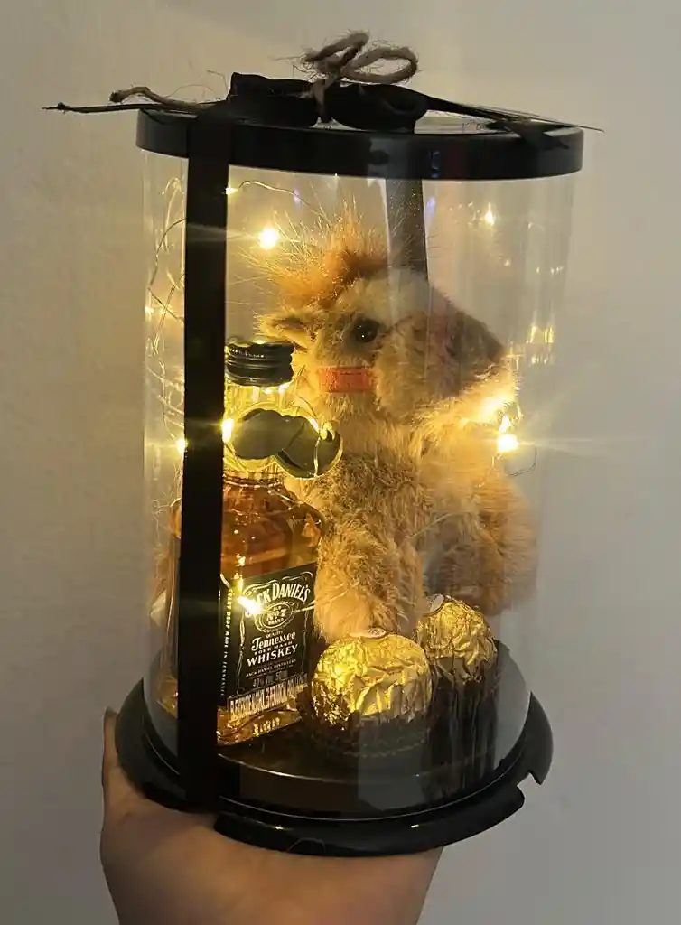 ANCHETAS DETALLES O REGALOS PARA HOMBRE CILINDRO CABALLO + JACK DANIELS MINI + CHOCOLATES FERRERO COD.1040-1 (( INCLUYE LLAVERO CABALLO, JACK DANIELS MINI, CHOCOLATES FERRERO, LUCES, DECORACION ))