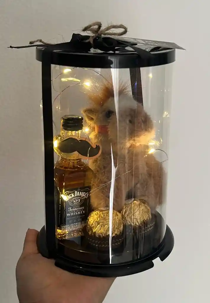 ANCHETAS DETALLES O REGALOS PARA HOMBRE CILINDRO CABALLO + JACK DANIELS MINI + CHOCOLATES FERRERO COD.1040-1 (( INCLUYE LLAVERO CABALLO, JACK DANIELS MINI, CHOCOLATES FERRERO, LUCES, DECORACION ))