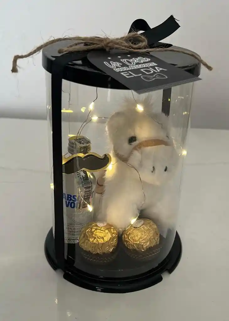 ANCHETAS DETALLES O REGALOS PARA HOMBRE CILINDRO LLAVERO CABALLO + VODKA MINI + CHOCOLATES FERRERO COD.1040-2 (( INCLUYE LLAVERO CABALLO, VODKA MINI, CHOCOLATES FERRERO, LUCES, DECORACION ))