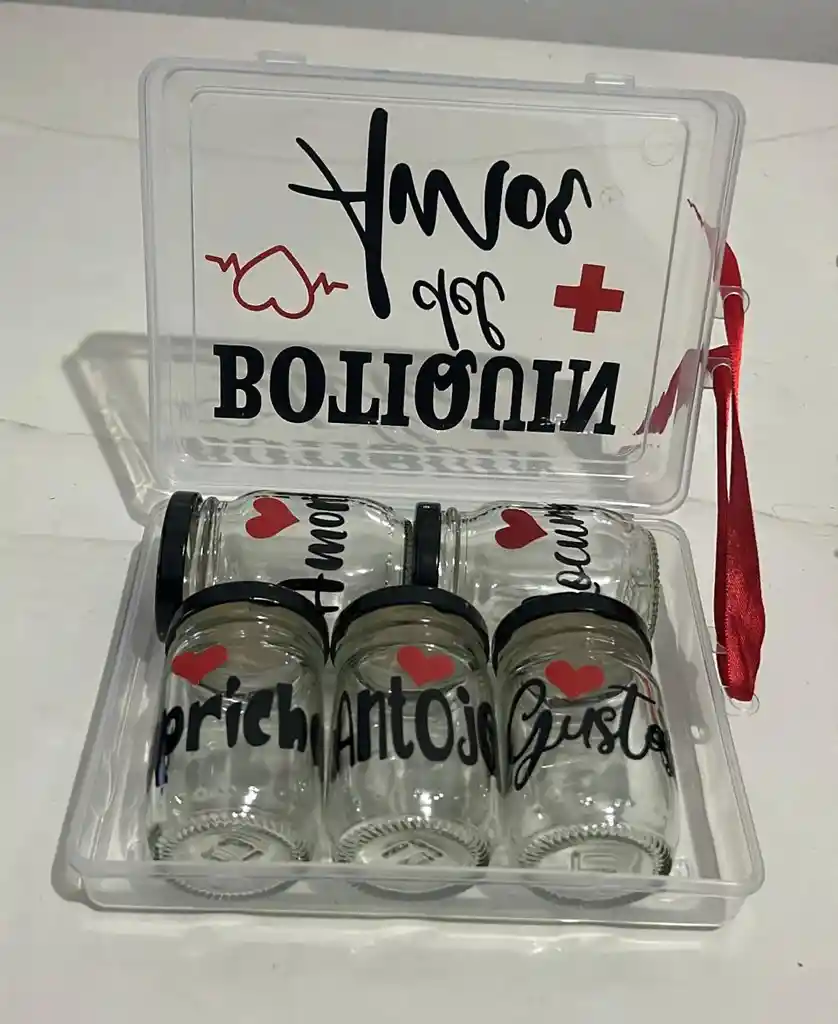 ANCHETAS O REGALO REGALO BOTIQUIN DE AMOR COD.4896 (( CONTIENE 5 ENVASES DE VIDRIO QUE PUEDES LLENAR CON DULCES DE TU PREFERENCIA ))